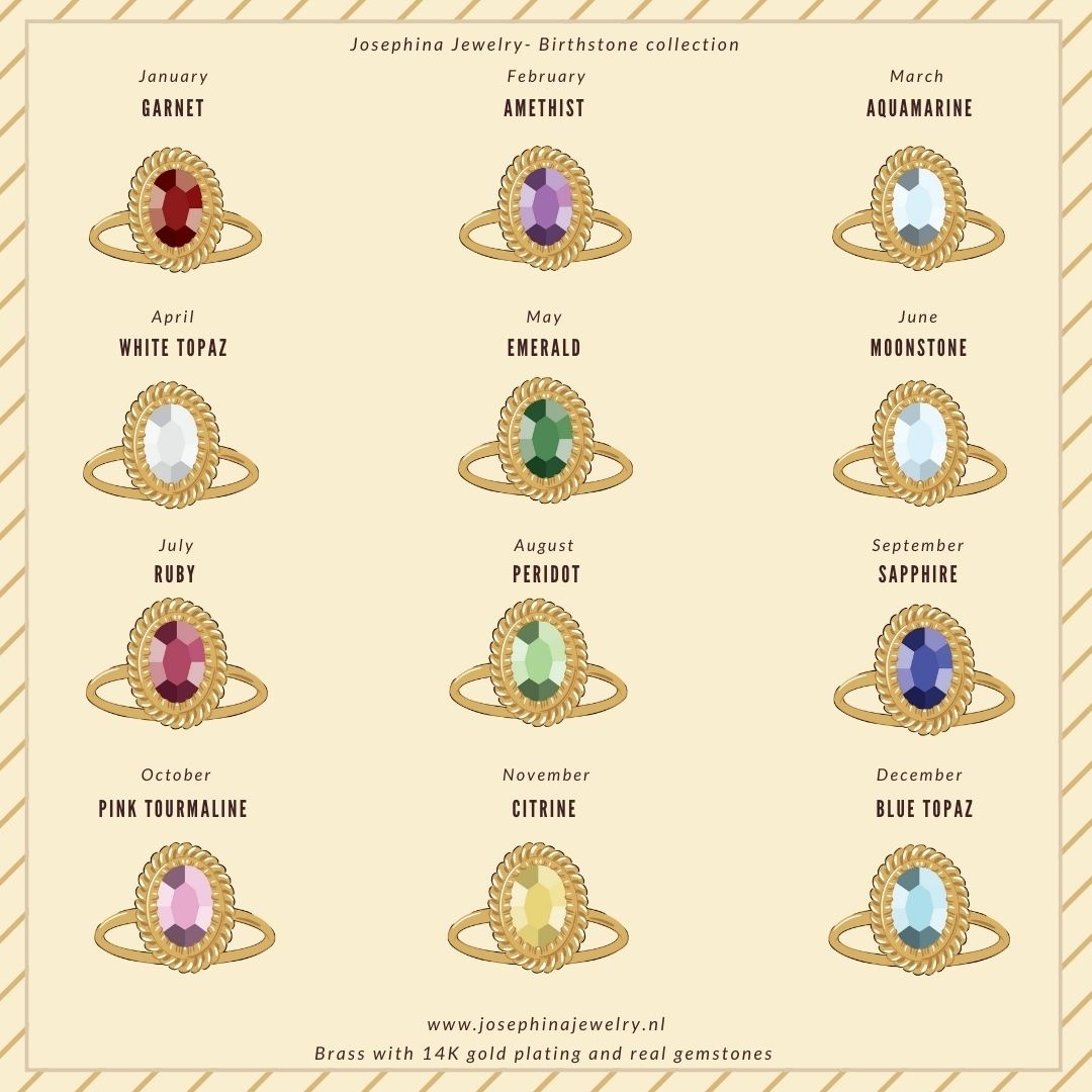 Shop jouw birthstone ring bij Josephina Jewelry. Bij iedere maand van het jaar hoort een bepaalde edelsteen. De edelsteen die bij een specifieke maand hoort noemen we een geboortesteen. Edelstenen hebben een geneeskrachtige werking en een specifieke betekenis. Je kunt dus kijken naar welke maand je geboren bent en welke edelsteen daarbij hoort. Het dragen van de edelsteen in de maand waarin je geboren bent geeft je bepaalde krachten. Je kunt je eigen geboortesteen dragen of draag de geboortesteen van iemand die je dierbaar is.